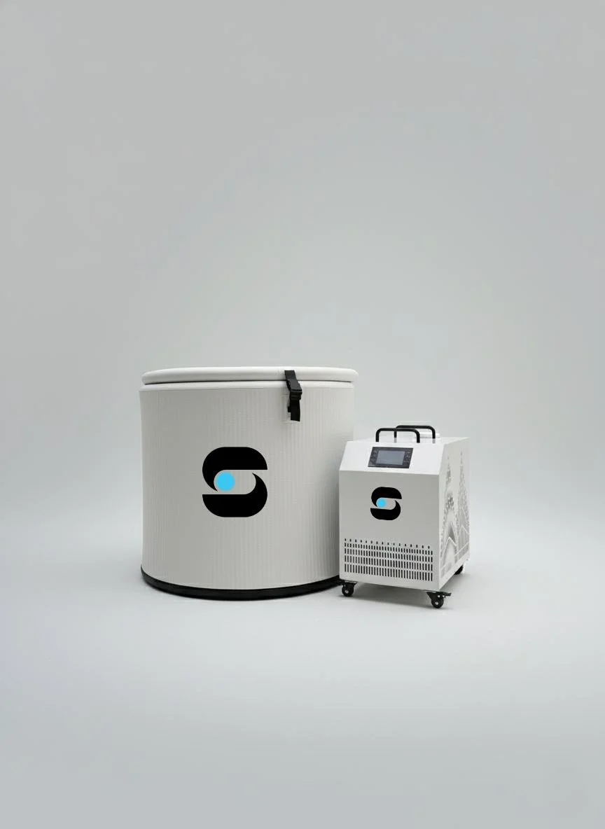 Ice Bath Rental with an inflatable ice bath and machine that cools and heats.